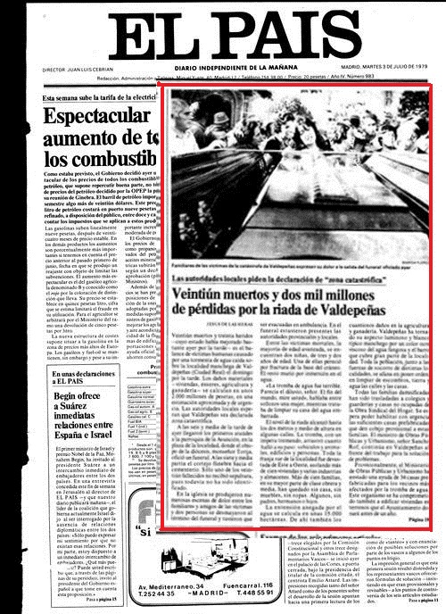 «Veintiuna personas muertas, treinta heridas leves y cerca de 2.000 millones de pesetas en daños materiales ha causado un fuerte aguacero de cuatro horas y media de duración, caído el domingo, día 1 de julio, sobre el pueblo manchego de Valdepeñas (Ciudad Real).
